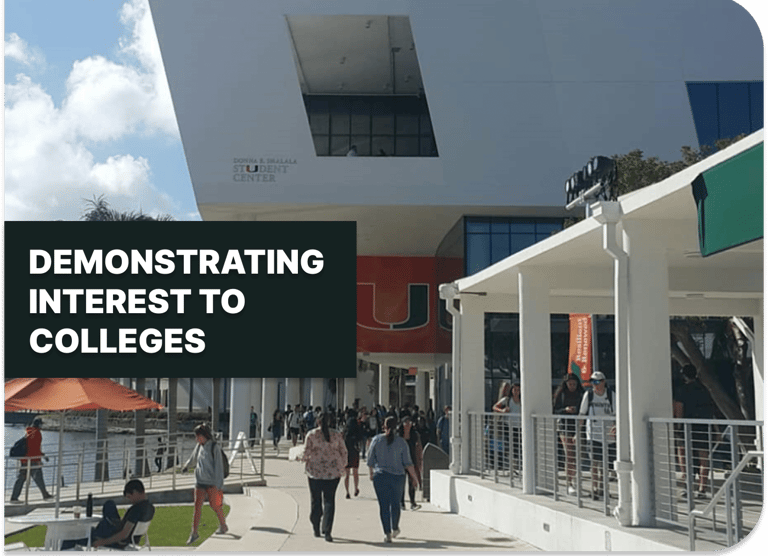 2. College Visits: College visits can help you effectively demonstrate your interest to admissions officers. Research what to expect from an in-person tour, as attending an official visit signals your enthusiasm and commitment to the school. Beyond visiting in person, take advantage of opportunities to connect with admissions representatives when they visit high schools in the fall. Attending these sessions, asking thoughtful questions, and following up can reinforce your interest and leave a lasting impression. Review more information on this topic HERE!
