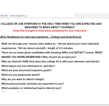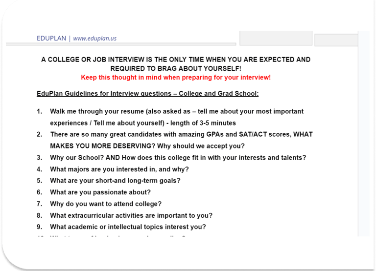 Finally, once you have completed the first coaching session, schedule your second 30-minute coaching session, which will consist of a 25-minute mock interview with 5 minutes for your questions to the interviewer. Please schedule our meeting using this link: meet.eduplan.us.