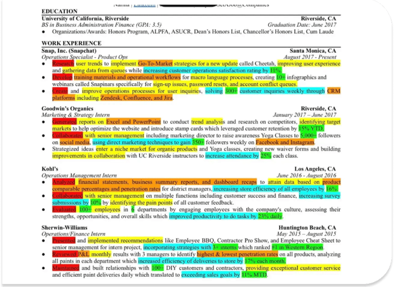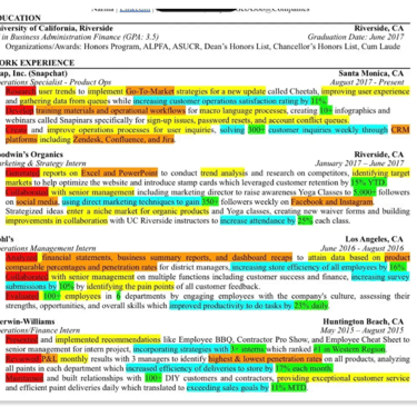 CLICK HERE to review a sample resume that highlights the smart use of information to catch reader's attention. Use the color legend below to understand what each highlight indicates in the above sample resume:
